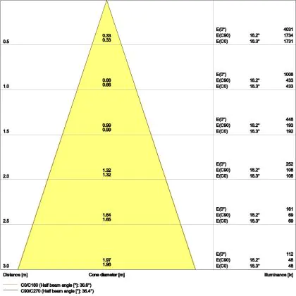 De lichtopbrengst en de gradenbundel spelen een grote rol. Zo geeft de lichtopbrengst van 480 Lumen in combinatie met de 36° stralingshoek deze inbouwspot een specifieke toepassing. Kort samengevat is een lichtintensiteit van maximaal 400 Lumen ideaal voor accentverlichting, terwijl hogere waardes goed gebruikt kunnen worden als basisverlichting. Over het algemeen geldt: hoe breder de gradenbundel, hoe geschikter deze is door basisverlichting. Dit komt doordat het licht over een groter oppervlak wordt verspreid. Smallere gradenbundels (tot 40°) kunnen echter bij hoge plafonds ook goed tot hun recht komen als algemene verlichting.